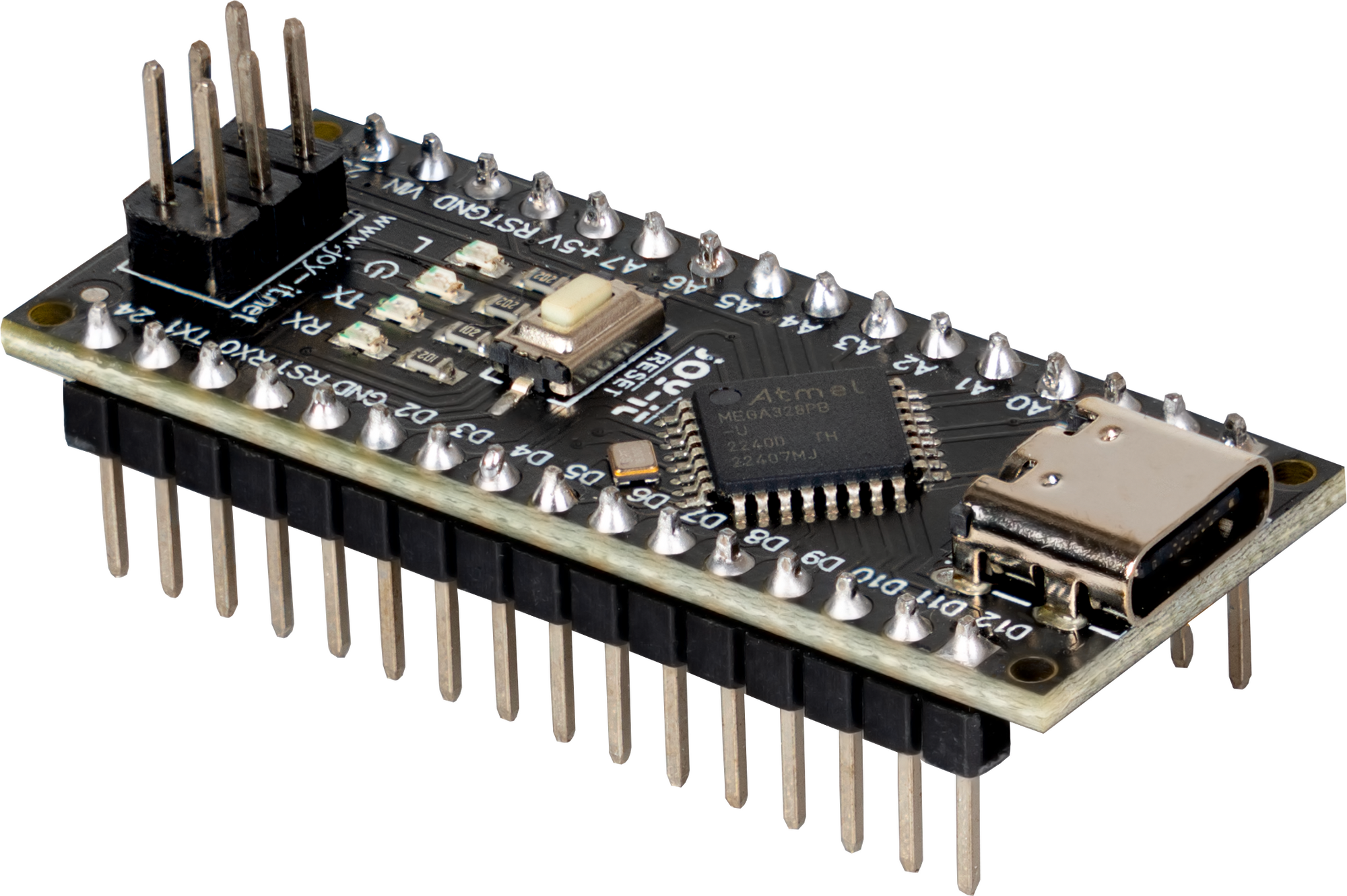 Das ARD Nano V4 ist ein besonders kleiner Mikrocontroller und durch die nach unten herausgeführte Stiftleiste, speziell für die Arbeit mit Steckboards entwickelt.