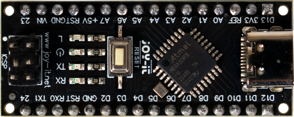 Über die integrierte USB-Typ-C Schnittstelle lassen sich sowohl Schaltung und Board mit Strom versorgen, als auch Programme auf den Mikrocontroller übertragen. Der NanoV4 ist vollständig kompatibel zum Arduino Nano V3.